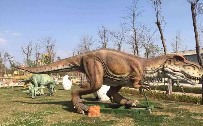 第二就是雕塑恐龍。他的制作工藝、材料分兩種,1、玻璃鋼材質(zhì),2、水泥雕塑。制作時還是需要鋼材作為恐龍的骨架,然后附上玻璃鋼、水泥雕塑的皮膚。這樣的恐龍可以做成不同的姿態(tài),栩栩如生。但是他做不了機械運動。他就是一只固定的恐龍雕塑。